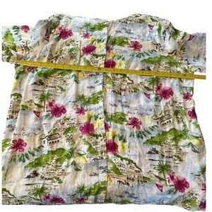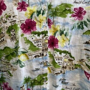 Cynthia Rowley 100% linen blouse in a 2X, featuring a vibrant watercolor-style Amalfi Coast scenic print—complete with florals, palm trees, coastal villages, and boats. Lightweight, breathable, and perfect for warm weather or vacation looks.
