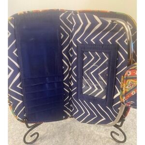 Vera Bradley wallet in a vibrant, colorful paisley print. This charming clutch features a secure snap closure and a beautifully organized interior with multiple card slots and a clear ID window. The interior lining showcases a coordinating navy and white zig-zag pattern. Its compact, curved silhouette makes it a stylish accessory for carrying essentials. Light signs of wear. Very clean! 8" length, 5" wide