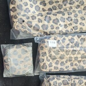 NWT Stylish Vera Bradley leopard print travel ditty bag, brush bag, and makeup bag set with mirror. Includes multiple pieces for versatile use. Perfect for travel and organization.
