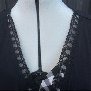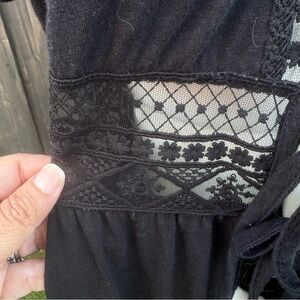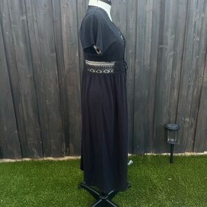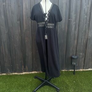 Sleek black maxi slub knit coverup in black. Solid black with lace detail. Ties in front with a flowing design. Ideal for the beach, pool or cruise.