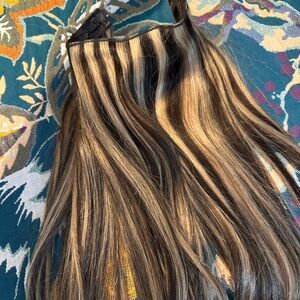 These are luxy brand hidden halo with clip weft including two matching aide wefts. They didn’t fit my hair color so I am reselling. They are brushed and replaced in box, otherwise like new. Size 16inches length. Over $100 new