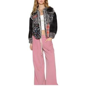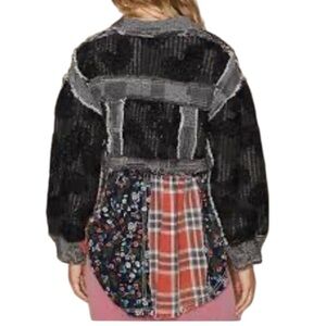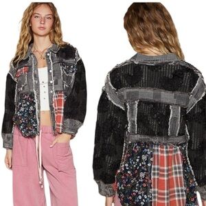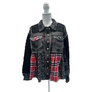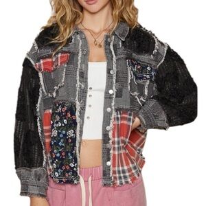 Discover this unique statement piece! The POL Crochet Patchwork Jacket blends boho-chic style with a vintage-washed aesthetic. Featuring a striking mix of distressed denim-style cotton, soft crochet sleeves, classic red plaid panels, and delicate floral prints, this shacket offers an effortlessly cool, layered look. The frayed seams add to its lived-in, artistic charm. It's the perfect statement piece for year-round wear.