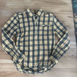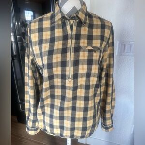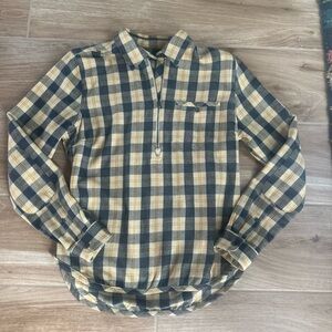 Toad&Co Bodie 1/4 Zip Long Sleeve Dress in a yellow and black plaid pattern S