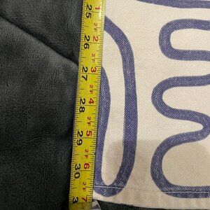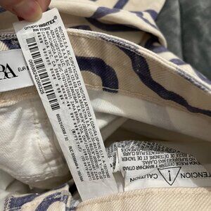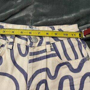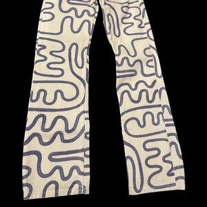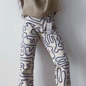 These are the ultimate "cool girl" statement jeans! Featuring a super unique blue abstract squiggle/graffiti swirl print over a crisp cream denim, these Zara fan-favorites are perfect for adding a pop of personality to your rotation.