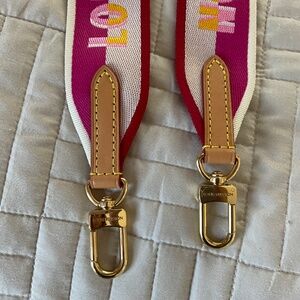 This is an authentic Louis Vuitton Speedy Strap. Logo with pink and pops of yellow. 36 inches long.