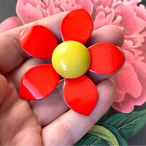 Vintage enamel on copper 5 petal flower power brooch orange yellow mod. Bright, sunshiney colors in a cute flower shape. Has a glow under black light. Unmarked.