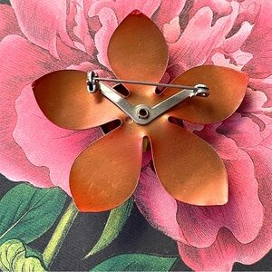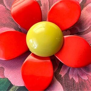 Vintage enamel on copper 5 petal flower power brooch orange yellow mod