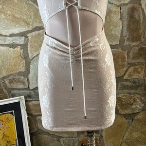 Outcast lace mini dress with a corset lace-up front and open back cutout. Super flattering fit with delicate lace details and a fully lined feel. Perfect for festivals, nights out, or layering for that Y2K vibe.