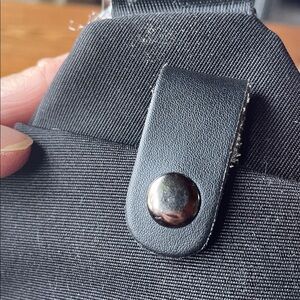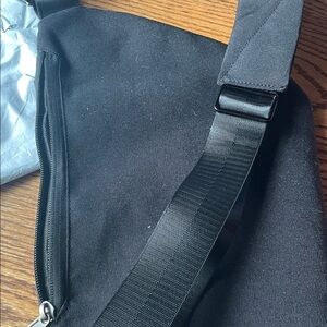 Sleek and versatile black men's crossbody bag, perfect for everyday use. Features a modern design with durable materials. Two zippered pockets on front and 1 big one along side. Snap pocket at top. Padded adjustable strap.