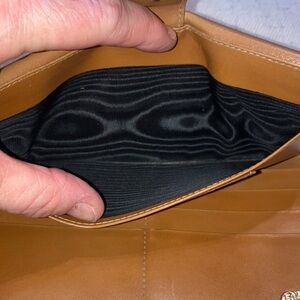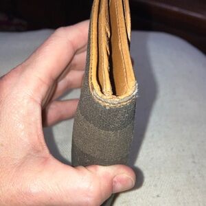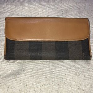 Elegant Fendi wallet with black and brown stripes. Features a tan leather clasp. Perfect for everyday use. In good vintage condition. Has some rubbing on corners otherwise in good condition.