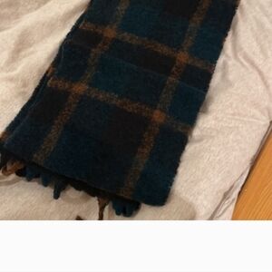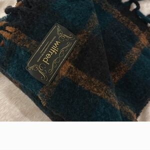 Elevate your style with the Wilfred teal and brown plaid scarf. Perfect for adding a touch of elegance to any outfit.