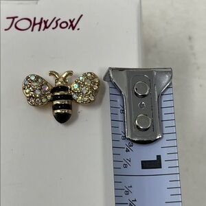So cute and new with tags in box bumblebee earrings from BETSEY Johnson. Gold with black stripes on the body. Iridescent rhinestones on the wings and green rhinestone eyes.