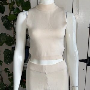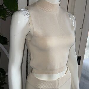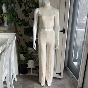 Step into style with this elegant cream sleeveless crop crew neck light sweater material XL (fits more like a S/M) Bottoms are wide leg size L (S/M) NWOT. Perfect for any occasion, this 2 piece offers both comfort and sophistication.
