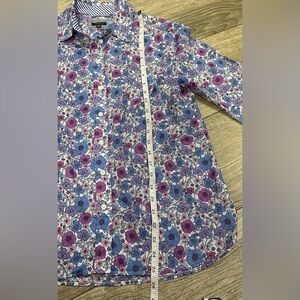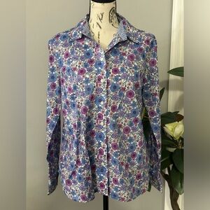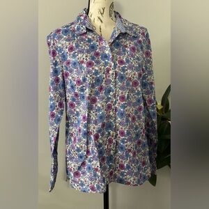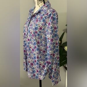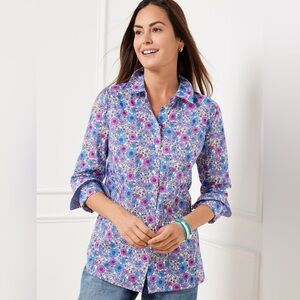 This stylish top from Talbots features a notched collar and a vibrant mix of purple and blue tones. The 3/4 sleeves and buttoned design make it a versatile choice for various occasions, offering both comfort and elegance.