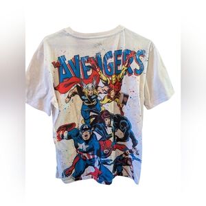 White t-shirt featuring Marvel Avengers graphic. Includes Thor, Iron Man, Captain America, and more.