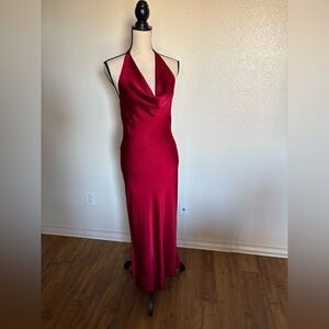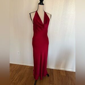 This stunning red halter dress is perfect for any special occasion. Its elegant design and vibrant color make it a standout piece in any wardrobe. Cut on the bias, mid-calf length, weighted neckline that ties at back of neck, invisible side zipper