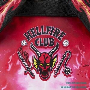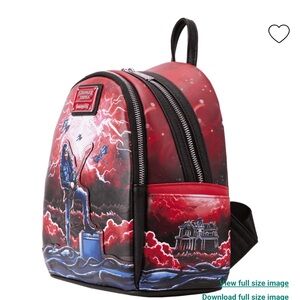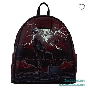 Strike up a storm in the Upside Down with our Loungefly Netflix Stranger Things Eddie Munson Tribute Mini Backpack. Eddie Munson rocks out on the front of this backpack as Demobats fly through the clouds and lightning strikes. Lightning storm art covers the entire backpack, including the side pockets, which also feature the Creel Mansion on one side and a collection of amps on the other. A hidden pocket in the seam where the front panel meets the top gusset creates extra space for securing smaller items on your journeys. On the back, the Hellfire Club logo appears, and in the dark, the lightning strikes on the front glow. Take on Vecna—or your day—in style and rock your look.