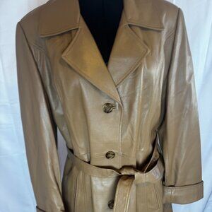 Vintage Chic Peruzzi Italy Caramel Brown Leather Tie Trench Coat Sz Lg