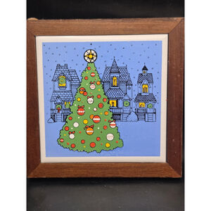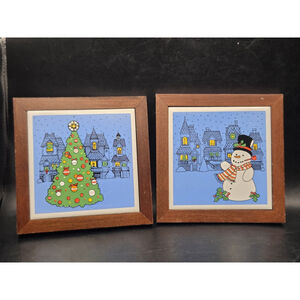 Trivets 2 Jasco Christmas Tree & Snowman Tile Wood Framed 5.25 Inch Square Vtg