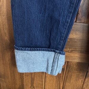 High-waisted dark blue jeans. Rolled cuffs. Classic five-pocket style. Like new.