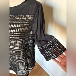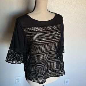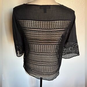 Chic black blouse with sheer crochet design. So rock n roll. Perfect for layering. Stylish and versatile. You will be mine, valentine.