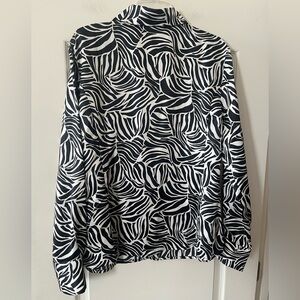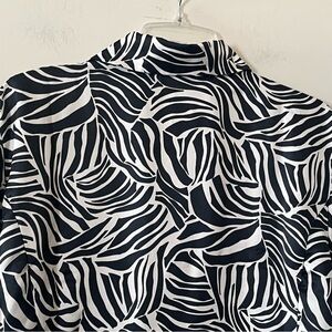 NWOT Includes extra button. Stylish pattern print button-up shirt. Features a bold black and white pattern. Button cuff. Collar. Polyester. Measurements in photos. Smoke free home. Smooth fabric. Flowy. Women’s size 18.