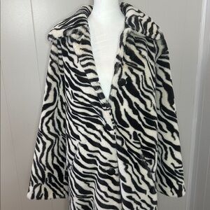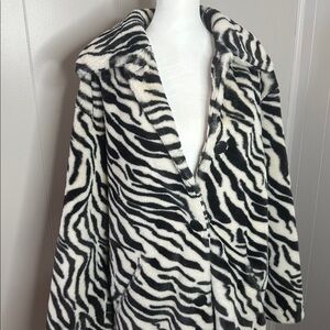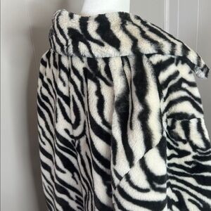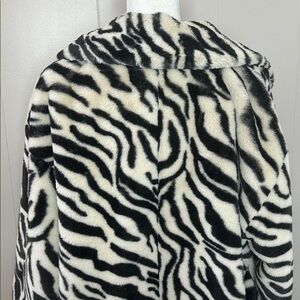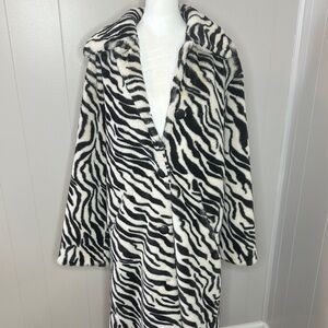 Designed to add effortless edge to absolutely any look, this head-turning jacket is featured in a slouchy, longline silhouette and stunning, zebra printed faux fur fabrication for an added touch of texture.