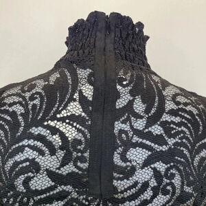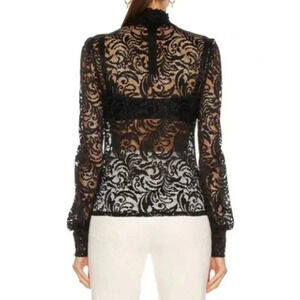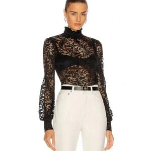 L'Agence Samara Black Sheer Lace Long Sleeve Bell Sleeve Turtleneck Top size XS. Victorian-inspired lace turtleneck for a romantic look. Sheer black lace. Ruched turtleneck with ribbon trimmed exposed zipper at back. Long bell sleeves. Worn with a bralette or cami as pictured. Nylon elastane blend. Dry clean. Missing the inside care tag. New with tags, in new condition. Romantic, Victorian, Paris style.