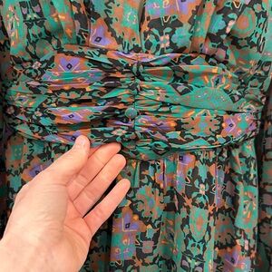 NWT! Gorgeous and unique long sleeve plunging neckline dress. Semi sheer fabric with adorable buttons on sleeve and lite shoulder pads to hold shape.