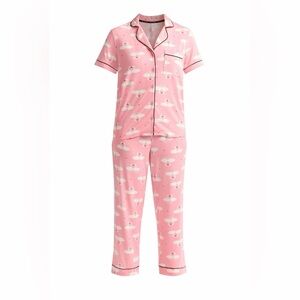 Joyspun Women's Dreamy Soft Collection Notch Top and Pants Pajama Set pink with a white swan pattern. The set features a notch-collar, short-sleeve top and matching Capri pull-on pants with pockets , both accented with contrast black piping.