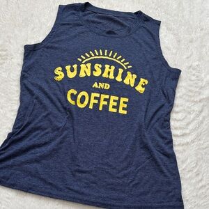 Embrace casual comfort with this navy tank top featuring a vibrant 'Sunshine and Coffee' print. Perfect for relaxed days. Size M. Soft and comfy for a nice walk or casual wear with shorts. Great condition and smoke free home
