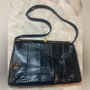 Beautiful vintage handbag by CORET Handbags, proudly made in Canada. This timeless piece features a striking black snakeskin-textured front panel paired with smooth genuine leather throughout the rest of the bag — a perfect blend of texture and classic elegance. The structured silhouette is finished with a gold-tone frame closure and a clean leather back, giving it that polished vintage sophistication that never goes out of style. Inside you’ll find a quality vintage CLIX zipper pocket for essentials. Details: • Width: 11 inches • Height: 7.5 inches • Strap drop: 6.5 inches (adjustable up to approx. 13 inches) • Snakeskin-textured front panel with leather body • Made in Canada • Adjustable strap for shoulder or hand carry Condition: Very good vintage condition with light, age-appropriate wear — beautifully preserved and ready to be styled for years to come. Perfect for everyday chic, vintage lovers, or adding a subtle statement texture to any outfit. Classic, elevated, and effortlessly timeless ✨