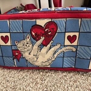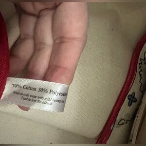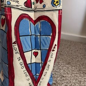 The tote is made of durable canvas material with heart design that adds a playful touch. The tote has a rectangular shape and a medium size, making it perfect for carrying everyday essentials. It comes with canvas handles that are comfortable to hold and easy to carry. The tote has a beige lining color that complements the exterior design.