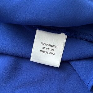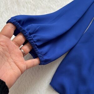 Stylish blouse with a deep V-neck. Long sleeves with gathered cuffs. Perfect for versatile wear. This bright royal blue is so pretty! Size L. Is kind of a loose fit not snug. Looks great with a blazer. Excellent condition and smoke free home