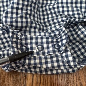Blue gingham bubble ruffle romper by Carter’s, perfect for warm-weather wear or play. Features adjustable shoulder straps with two button settings to grow with your child, plus snap closures at the bottom for easy changes.