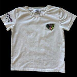 White tee featuring a unicorn on the sleeve. Vibrant 'Cute' patch on the chest. Perfect for fun outings. In great gently used condition. No stains no pills.
