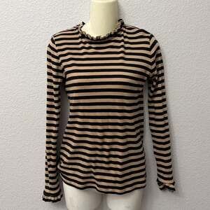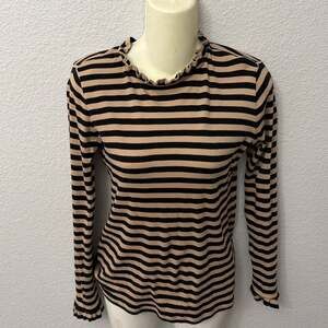Striped long-sleeve top featuring a chic ruffled neckline and cuffs in a beige and black color palette. This lightweight, form-fitting blouse is perfect for layering or wearing on its own for a Parisian-inspired look. Pre-owned condition with no visible holes or staining. Versatile piece for casual outings or office wear. Soft, stretchy fabric ensures all-day comfort. Size XS