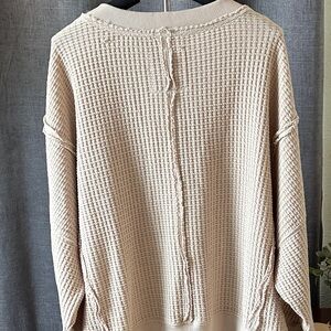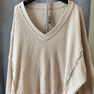Chic V-neck waffle knit long sleeve shirt. Ideal for layering. Oversized. A few small snags