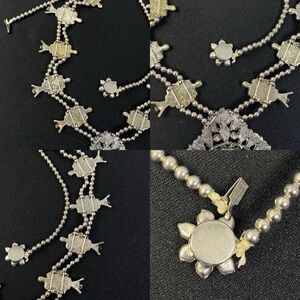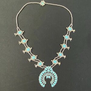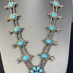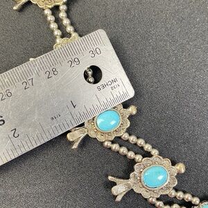 There are a few areas that the silver tone has tarnished, or oxidized. It's not terrible. It's mostly on the back but you can see a few areas on the front. The flower closure in the back maybe an addition. You can see the knots and a little glue. This is 26" long total. The squash blossom is 2.5" long. I believe this is faux turquoise and actually a poured glass.