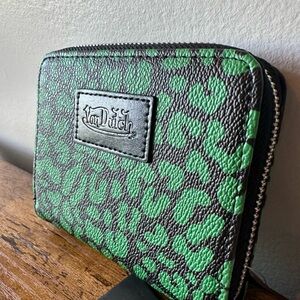 Bold green and black cheetah print wallet featuring iconic black patch Von Dutch logo. Compact and stylish design. Ideal for everyday use. Measures 4 1/2 x 4 inches. Back spells Von Dutch in cheetah print. Women’s or unisex. Brand new with tags.