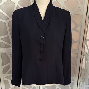 Sophisticated navy blue blazer with a tailored fit. Features a sleek button-up front. Ideal for business or formal settings.