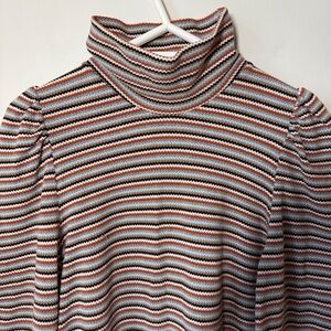 Eve Gravel Warren pullover mock neck top multicolor striped pique knit. See closeup up for colors. Long puffy sleeves with cuffs. Pit to Pit 19.5” length 22” Missing composition label.