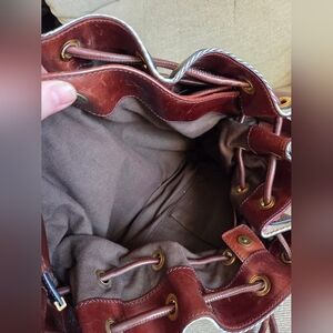 GUC gorgeous large Burberry shoulder bag. canvas and leather, I believe this is called a warrior bag. 3 compartments. one with a zipper closure and 2 with a magnetic closure. front closure will open and allow for tighter or looser opening with the 4 leather pieces. all in working condition. gold tone hardware. some scuffs and marks expected with a used bag, but lovely condition. measurements shown in photos. comes with the HUGE dust bag shown. smoke free home. offers welcome. ❤️
