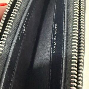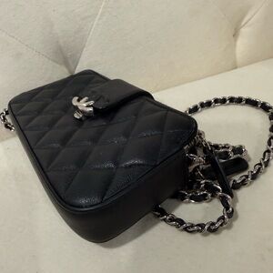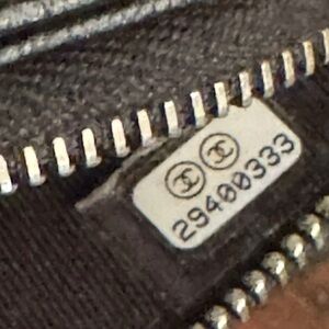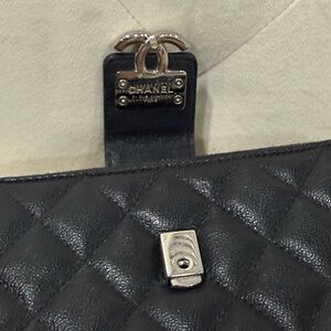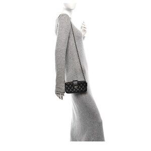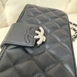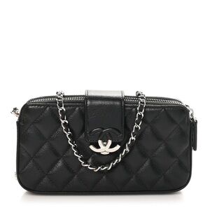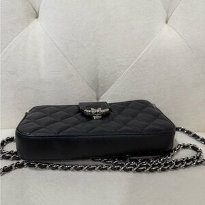 Stylish black quilted wristlet. Features iconic silver chain and logo. Ideal for chic outings.