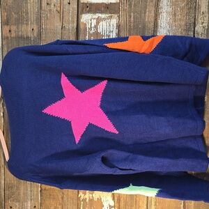 Cozy blue sweater featuring vibrant star accents on the sleeves. Perfect for a casual look.