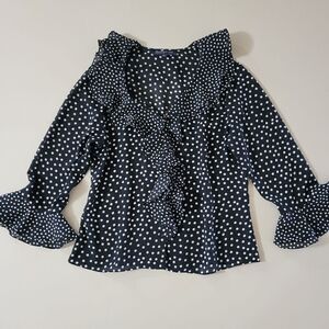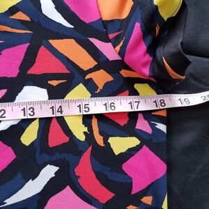 Button back blouse by Anne Klein in cute & colorful glass like pattern with navy, black, pink, orange, red, yellow, and white colors. Excellent condition.