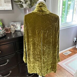 Elevated vintage-inspired silk velvet cardigan jacket by Kathleen Sommers in a rich dijon/chartreuse hue. This open-front layering piece drapes effortlessly with a luxe, fluid silhouette—perfect for adding quiet drama to everyday looks or evening ensembles.