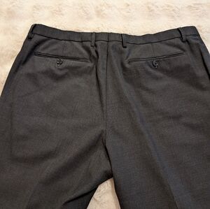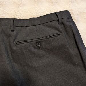 These Banana Republic Men's Slim Fit Black Dress Pants in size 38x32 are perfect for formal and business occasions. Made of a wool blend material, they feature a solid black color with a mid-rise fit and straight leg style. The pants have a button closure and are designed for a slim fit, making them a stylish choice for the city or preppy look. The elegant red striped inner lining adds a touch of sophistication to these dress pants, which are ideal for year-round wear.