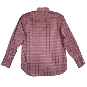 J Crew Ludlow long sleeve button down shirt in a men's size large. This shirt features a red base with a blue and white plaid pattern. The fabric is 120s 2 ply cotton.