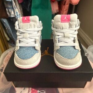 The Air Jordan 1 Mid SE TD 'Denim Sequin' makes over the classic silhouette with a washed blue denim upper, fortified with grey suede overlays at the forefoot and heel. A sequined pink suede Swoosh appears on the lateral side, while the medial-side Swoosh is rendered in glossy pink patent leather. Additional vibrant pink accents land on the woven Jumpman tongue tag, the Wings logo on the lateral collar flap, and grippy rubber outsole.